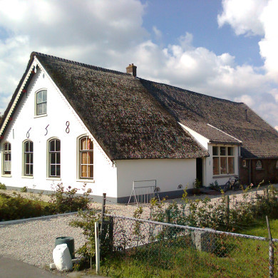 Geel gepleisterde boerderij, laag langhuis, 17e eeuw, afgewolfde voorgevel met riet gedekt.