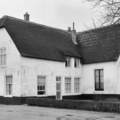 Gepleisterde boerderij, dwarshuis, deels 17e eeuw, met riet gedekt, vooruitspringende vleugel.
