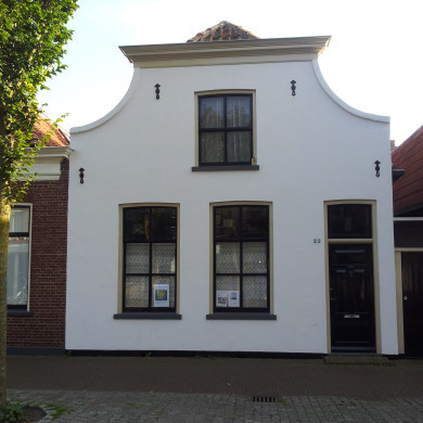 Woonhuis onder zadeldak met gepleisterde afgeknotte ingezwenkte topgevel.