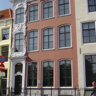 Huis met geverfde lijstgevel. Dakkapel. Eenvoudige voordeuromlijsting; gebogen kalf; rozetbovenlicht. Hardstenen plint; hardstenen stoeptreden. XVIII.