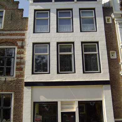 Huis met gepleisterde lijstgevel. Het fries voorzien van consoles. Dakkapel. XVIII. Moderne cafe pui.