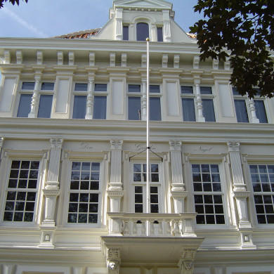 Imposante gepleisterde lijstgevel in Neo-Renaissance trant. Gebosseerd beneden gedeelte met cartouches, waarin engelenkopjes. Hoofdverdieping met fantasiepilasters en schuiframen; tweede verdieping met kruisramen. 1881. Architecten: W. van Lookeren Campagne en E.Gonfeld von Felbert. Museum.