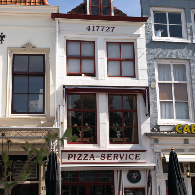 Huis met gepleisterde lijstgevel en dakkapel. Fries voorzien van dubbele tandlijst. Moderne winkelpui. XVIII.