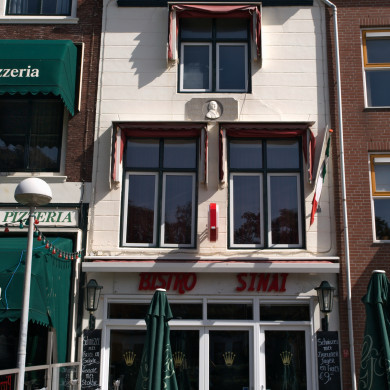 Huis met gepleisterde gevel. Eenvoudige voordeuromlijsting met rozetbovenlicht. XVIII. Gevelsteen met buste van Jacobus Bellamy. XIX.
