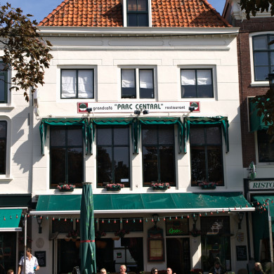 Huis met lijstgevel, schilddak en getoogde dakkapel. Lijstfries voorzien van vier gesneden asymmetrische rocococonsoles. Getoogde vensters met middenstijl. Moderne cafe-pui. XVIII C.