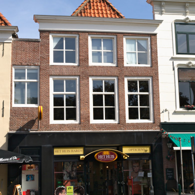Huis met gepleisterde lijstgevel. Dakkapel. Moderne winkelpui. XVIII.