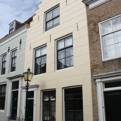 Pand met verdieping en schilddak, 17e of 16 eeuw. Gevel met bosschage bepleistering en houten kroonlijst met verdiepte velden en gesneden consoles, derde kwart 19e eeuw. Vensters en deur hebben geprofileerde omlijstingen met afgeschuinde hoeken en kuiven van stucwerk.