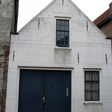 Pakhuisje met zadeldak en gepleisterde puntgevel, 18e eeuw.