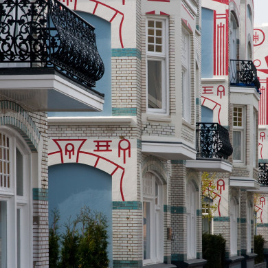 Als een eenheid opgevat huizenpaar in Art-Nouveau-vormen, begin 20e eeuw.
