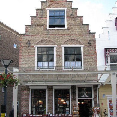 Pand met forse lijstgevel onder fraaie kap met topschoorsteen. Dakkapel. XVIII.