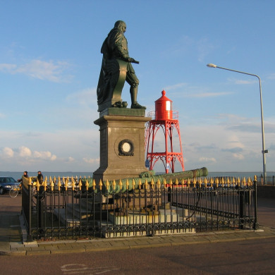 Standbeeld van Michiel Adriaanszoon de Ruyter. (1841) door L. Royer. Hierbij opgesteld twee bronzen scheepskanonnen, gegoten respectievelijk 1617 en 1622.