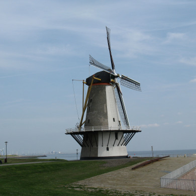 Oranjemolen. Ronde, stenen bovenkruier met stelling, 17e eeuws. Gelegen op het Oranjebolwerk aan de Schelde.