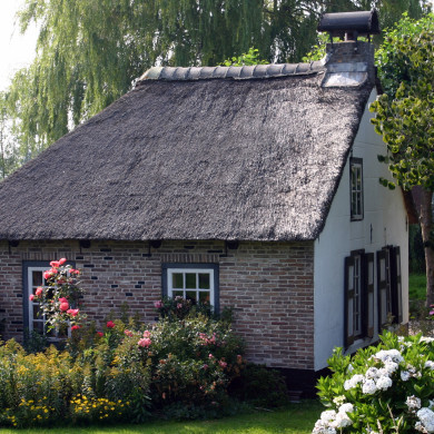 Gaaf bewaard ZOMERHUIS (ca. 1800) met aan de voorzijde een later beklampte puntgevel en opzij een strodak met dakkapel. Oude kozijnen en luiken.