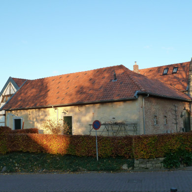 Hoeve van mergel en baksteen, XVIII; aan de gesloten binnenplaats een vakwerkfragment, XVII, waarin een ingang met hoekkorbeeltjes.