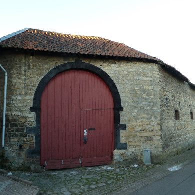 Hoeve van mergel en baksteen, XVIII; aan de gesloten binnenplaats een vakwerkfragment, XVII, waarin een ingang met hoekkorbeeltjes.
