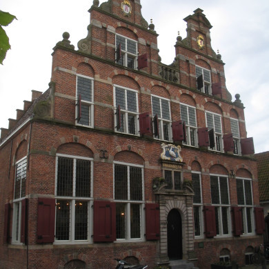 Swaensteijn, v.m. herberg en rechthuis, rijke brede gevel, ingangspoort 1637 met leeuwen en gebeeldhouwde gevelsteen met zwaan. Achter de gevel twee evenwijdige daken, zodat middenstuk horizontaal afgedekt wordt. Aan de achterzijde twee gepleisterde trapgevels.