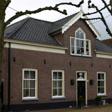 Boerderij met topgevel en houten gekartelde daklijsten, midden 19e eeuw.