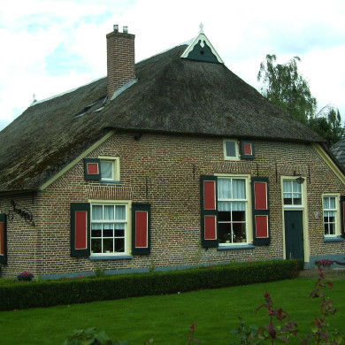 Boerderij omstreeks 1800 met rieten wolfdak. Vensters met luiken en negen- en zesruitsschuiframen.