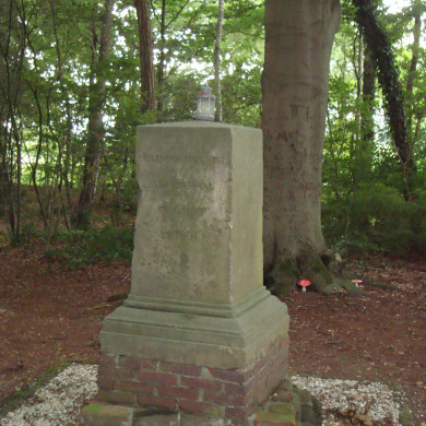 Groot zandstenen gedenkteken op geprofileerde voet op opschrift. Opgericht in 1837.