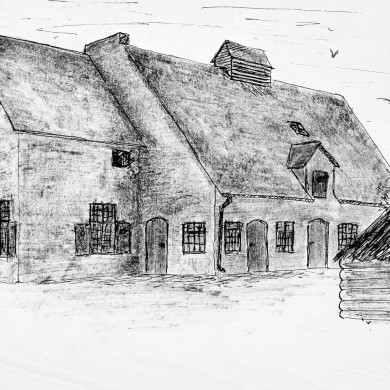 Boerderij van het Kempische langgeveltype onder rieten wolfdak met voet van pannen.