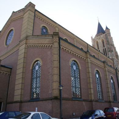 In 1849-51 naar ontwerp van I. Warnsinck ter plaatse van de in 1844 afgebroken Gotische hallenkerk en in aansluiting op de - afzonderlijk beschermde - Middeleeuwse Sint Janstoren gerealiseerd. Het in rode baksteen, afgewisseld door gele sierstenen, op een natuurstenen plint onder met leien gedekte zadel- en lessenaarsdaken opgetrokken kerkgebouw is recht afgesloten en bevat aan de oostzijde een uitgebouwd ingangsportaal, waarbij de hoofdingang is voorzien van dubbele paneeldeuren, halfrond en onderverdeeld bovenlicht, houten pilaster-omlijsting en twee lantaarns met smeedijzeren voluut-arm, voorts een roosvenster in de punttop en smalle zij-ingangen te weerszijden in het portaal.