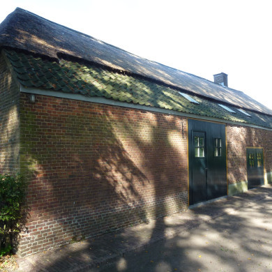 Boerderij van het Kempische langgeveltype, onder rieten wolfdak met voet van pannen en aan de kop en topgevel waarin jaarstenen 1718 en een hartmotief.
