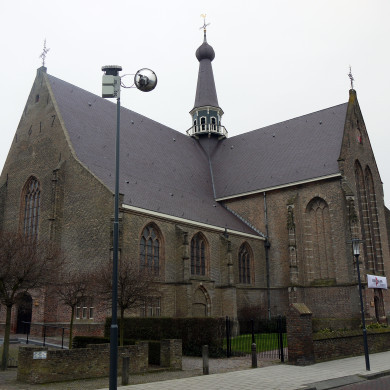 Ned. Herv. Kerk. Laatgotische kruiskerk, bestaande uit een omstreeks 1450 gebouwd koor van drie traveeën met driezijdige sluiting een breed dwarspand waarvan de binnenste traveeen omstreeks 1470 en de buitenste tegen 1525 zijn opgetrokken, en tenslotte een driebeukig, door een zadeldak overdekt schip van drie traveeen. De westgevel is blijkens jaarankers in 1617 gebouwd, nadat een rond 1465 gebouwde toren op het eind der 16e eeuw verwoest was. Op de kruising een dakruiter uit 1617, met door een peer bekroonde spits. In de oostmuur van de noorderdwarsarm twee dichtgemetselde scheibogen van een verdwenen kapel. Inwendig zuilen met achtkante basementen en lijstkapitelen; houten tongewelven in het schip, stenen kruisribgewelven in het koor. Gerestaureerd in 1939. Preekstoel met koperen lezenaar uit 1658; 18e eeuwse koperen lezenaar. Van oorsprong eenklaviers orgel in 1823 gemaakt door C. van Oeckelen en Zoon. In 1961 gerestaureerd en uitgebreid met een Bovenwerk en vrij Pedaal. Deze uitbreiding valt buiten de bescherming. Klokkenstoel met klok van J. Vermi, 1693, diam. 90,5 cm.