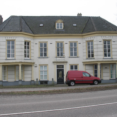 "De Rijnschans"; gepleisterd pand met verdieping (XIXc) onder met rode Hollandse pannen gedekt omlopend schilddak; gevels afgesloten met eenvoudige 22-zesruits schuifvensters; in de N.gevel voorts vier halfrond gesloten kelderlichten met diefijzers en twee ronde vensters; in het midden van de sym