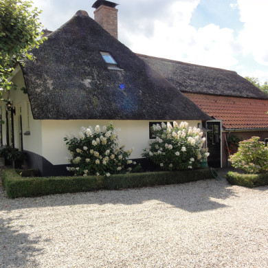 BOERDERIJ, omstreeks 1800, met gepleisterde voorgevel, waarin vensters met luiken en zesruitsschuiframen.