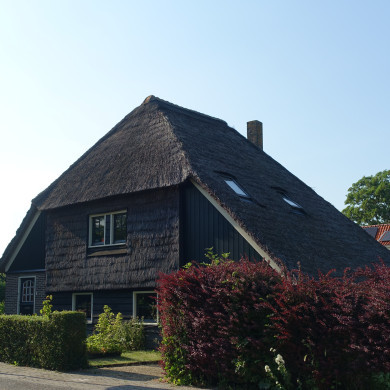 Pand van het in het noorden van Noord-Holland gebruikelijke boerderij-type bestaande uit een stelpvormige schuur aan een zijde afgeknot en met planken en riet beschoten. Voor de schuur een laag woongedeelte met riet gedekt. Plaatselijk bekend als Baanhuis, waarschijnlijk naar aanleiding van de in de eerste helft der 18e eeuw bestaande spinbaan.