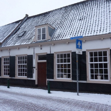 Gepleisterd rechthoekig herenhuis met rechte gootlijst en fraai gebeeldhouwde deur uit de overgang der 18e naar de 19e eeuw.