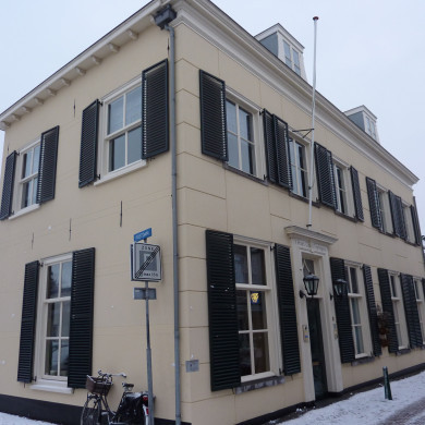 Gepleisterd rechthoekig herenhuis met rechte gootlijst en fraai gebeeldhouwde deur uit de overgang der 18e naar de 19e eeuw.