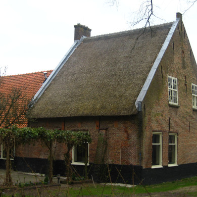 In oorsprong mogelijk 17e eeuwse BOERDERIJ waarvan het smalle, hoge voorhuis nog resteert, destijds behorend tot het kasteel Ter Weer, met later aangebouwd bedrijfsgedeelte. Voorhuis onder hoogopgaand rieten zadeldak tussen puntgevel met vlechtingen en staafankers; rechts onderkelderd, de kelder voorzien van een tongewelf en getoogde vensters met diefijzers; de opkamer bevat in de rechterzijgevel twee twaalfruitsvensters en een T-venster aan de voorzijde; de voorgevel is verder voorzien van schuifvensters zonder roedenverdeling met daarboven ontlastingsboogjes en twee vensters in de top; de linkerzijgevel bevat voorts drie schuifvensters en twee steunberen. Inwendig zware balken met geprofileerde sleutelstukken. Lager aangebouwd gedeelte onder pannen zadeldak met wolfeind aan achterzijde, rechts goot op klossen. Te linkerzijde aangebouwd stookhut onder pannen lessenaarsdak en een houten karnhuis onder pannen tentdak.