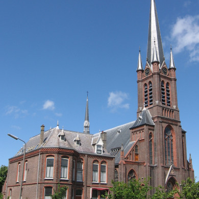 St.Jan de Doper, 1900-1901, A.A.J.Margry en J.M.Snickers. Pseudobasilicale KRUISKERK, de drie schipbeuken onder een dak. Toren met frontalen hoektorentjes. Gelede bakstenen pijlers, houten tongewelven over de hoofdbeuken. Stenen kruisribgewelven over de zijbeuken. Enigszins centraliserende opzet, driebeukige transept met driezijdige sluitingen.