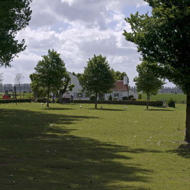 Voormalige fortificatie (kruisschans) bestaande uit een dubbel omgracht rechthoekig terrein op het midden waarvan een vrijstaand rechthoekig gebouw met een verdieping; boven de rechte door een lijst afgesloten gevels een schilddak met hoekpirons.
