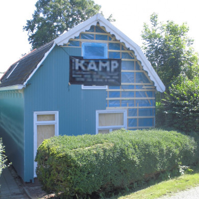 Laat 19e eeuws houten huis met zolderverdieping onder mansardekap; aan achterzijde geschulpte windveren; T-vensters.