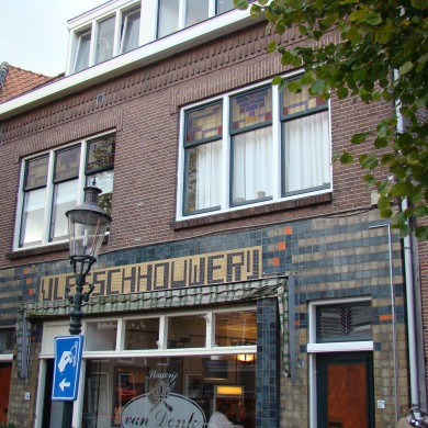 HOEKPAND bestaande uit woning en bedrijfspand onder gemeenschappelijk schilddak. De linkerhelft nr bestaat uit drie traveeën met negen- en twaalfruits schuifvensters, een hardstenen stoepje voor de toegangsdeur. Dit gedeelte van het huis is gepleisterd.
