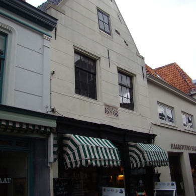 Pand onder schilddak, 17e of 18e eeuw. Gootlijst op klossen. Bovenvensters met negenruitsschuiframen. Pothuis.