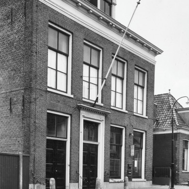Deftig midden 19e eeuws pand met hoge verdieping vier traveeën breed en afgesloten door geblokte kroonlijst waarboven halfrond gesloten dakkapel. Omlijste ingang en zesruitsvensters. Stoep met nog drie stoeppalen, met de gevel verbonden door kettingen.