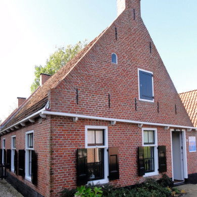 Eenvoudige visserswoning onder zadeldak tussen topgevels.