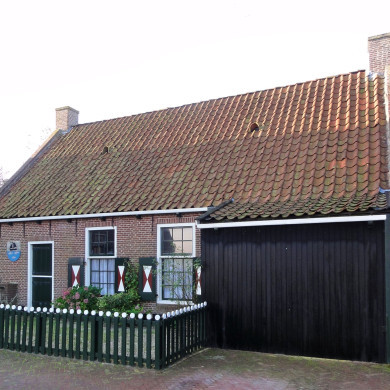 Pand onder zadeldak tegen topgevel met kleine openingen in de top.