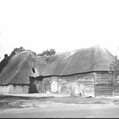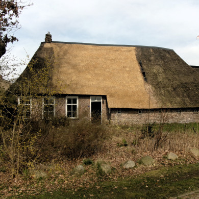 19e eeuwse boerderij met achter- en zijbaander onder rieten wolfdak, met uilebord aan achterzijde; twee schoorstenen, vlechtingen, windveren, staafankers.