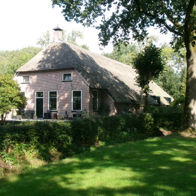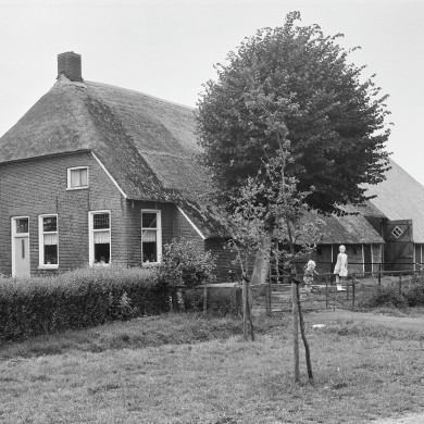 19e eeuwse boerderij met zijbaander onder rieten wolfdak met uilebord en windvaan aan achterzijde; windveren; staafankers, topschoorsteen. De van een sprong voorziene voorgevel symmetrisch ingedeeld: zesruitsschuifvensters en vierruitsschuifvensters, zesruitsvensters in de zijgevels.