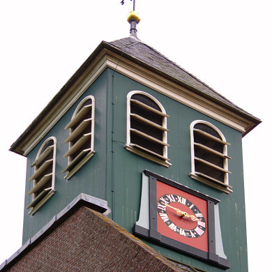 Toren der Herv. Kerk. Met leien gedekte dakruiter 1914. Mechanisch torenuurwerk van Hörz, circa 1920.
