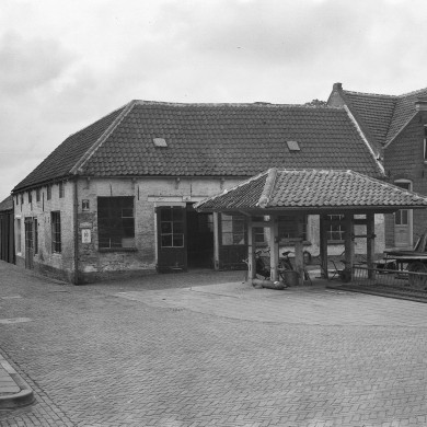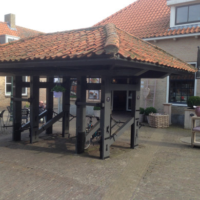 Dubbele HOEFSTAL, vrijstaand op de straat voor de smederij. Travalje gedekt door schildvormig pannendakje.