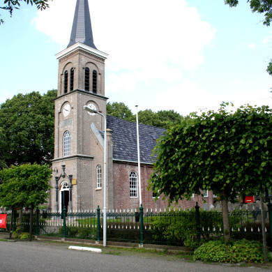 Herv. kerk. Eenvoudig eenbeukig kerkje uit 1806 met ruiter boven de westgevel.