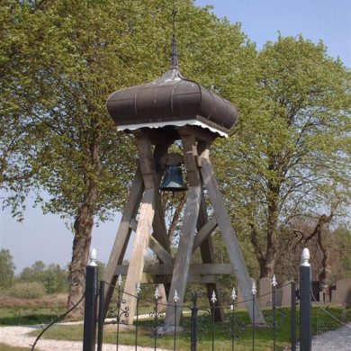 Op het kerkhof lage klokkenstoel met gedrukte gezwenkte kap (1820 ? kerk toen gesloopt).