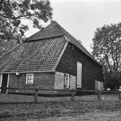 Boerderij van het Wieringer type. Houten schuren omstreeks 1800; één met rieten dak en één met pannendak.