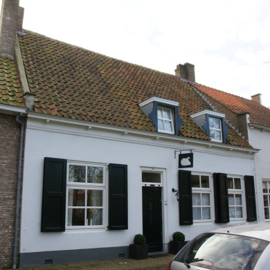 Huis met tuitgevel waarin bakstenen geprofileerde tooglijsten op maskersteentjes, geprofileerde bakstenen waterlijsten en sierankers, eind 16e of begin 17e eeuw. In de 18e eeuw gewijzigde vensters met kleine roedenverdeling.