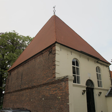 Doopsgezinde kerk. Bakstenen bouwwerk op ongeveer vierkante plattegrond met tentdak. Blijkens een stichtingssteen uit 1711. In de eenvoudige, slechts door geprofileerde bakstenen waterlijsten versierde muren rondbogige vensters. Inwendig een houten gewelf. Zesarmige, koperen kaarsenkroon, XVIII.